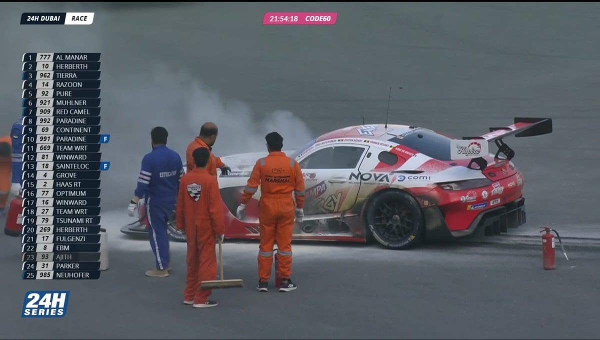 பெல்ஜியம் நாட்டைச் சேர்ந்த அயர்டன் ரெடாண்ட் (Ayrton Redant) என்பவர் அஜித்தின் அணியின் சார்பில் காரைச் செலுத்திச் சென்றார். ஓடுதளத்தில் கார் சீறிப்பாய்ந்து கொண்டிருந்தபோது, இயந்திரப் பகுதியில் (Engine) ஏற்பட்ட கோளாறு காரணமாகத் திடீரென கரும்புகை வெளியேறி கார் தீப்பற்றி எரியத் தொடங்கியது.