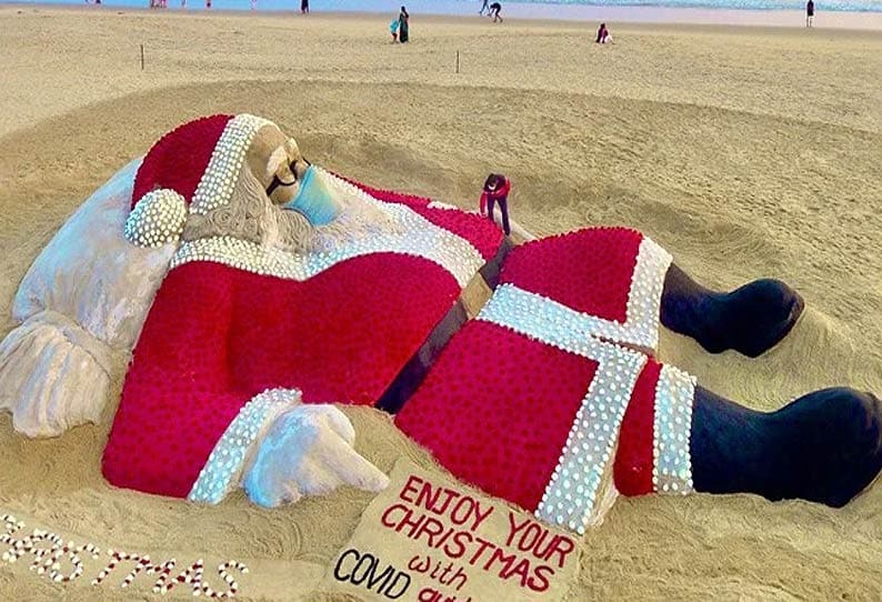 கொரோனா விழிப்புணர்வை ஏற்படுத்தும் விதமாக உலகப் புகழ்பெற்ற மணல் சிற்ப கலைஞரான சுதர்சன் பட்நாயக் 5400 ரோஜா மலர்களை கொண்டு கிறிஸ்மஸ் தாத்தா உருவத்தை வடிவமைத்து அசத்தியுள்ளார்.