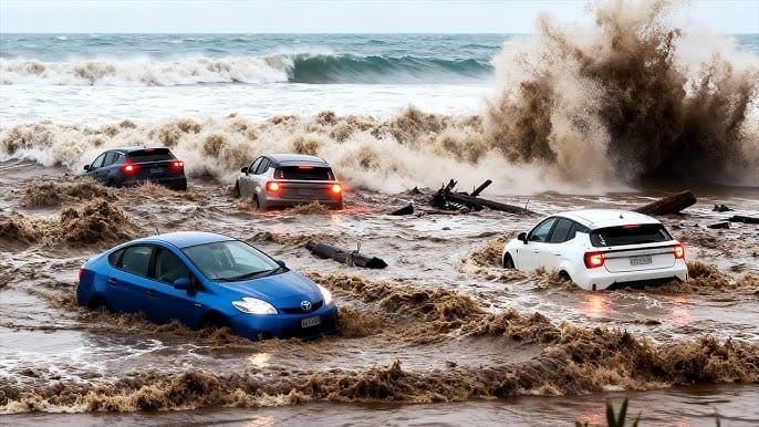 கடற்கரையோர வீதிகள் மற்றும் வாகன தரிப்பிடங்களில் நிறுத்தி வைக்கப்பட்டிருந்த நூற்றுக்கணக்கான வாகனங்கள் வெள்ளத்தின் வேகத்தில் அடித்துச் செல்லப்பட்டு கடலில் விழுந்துள்ளன. இது தொடர்பான காட்சிகள் அந்நாட்டு ஊடகங்களில் வெளியாகி அதிர்ச்சியை ஏற்படுத்தியுள்ளன.