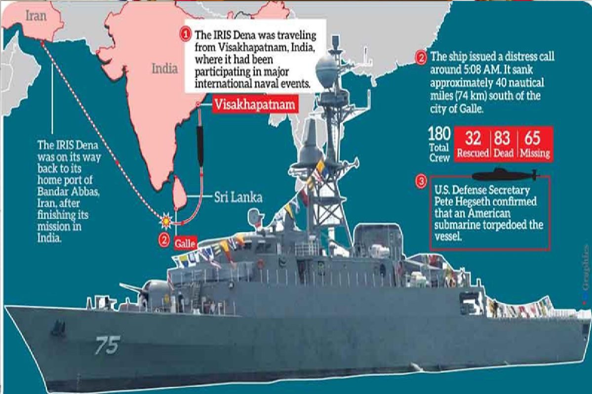 காலி கடற்பரப்பில் அமெரிக்க நீர்மூழ்கிக் கப்பல் நடத்திய டார்பிடோ (Torpedo) தாக்குதலில் மூழ்கிய முதலாவது ஈரானியப் போர்க்கப்பலான IRIS Dena விவகாரத்தில், இதுவரை 87 பேரின் சடலங்களை இலங்கை கடற்படை மீட்டுள்ளது. மேலும், 32 பேர் உயிருடன் மீட்கப்பட்டு கராப்பிட்டிய வைத்தியசாலையில் அனுமதிக்கப்பட்டுள்ளனர். உயிரிழந்தவர்களின் உடல்களைப் பாதுகாக்கப் போதுமான குளிர்சாதன வசதிகள் இல்லாததால், மேலதிக வசதிகளைத் திரட்ட அரசாங்கம் நடவடிக்கை எடுத்து வருகிறது.