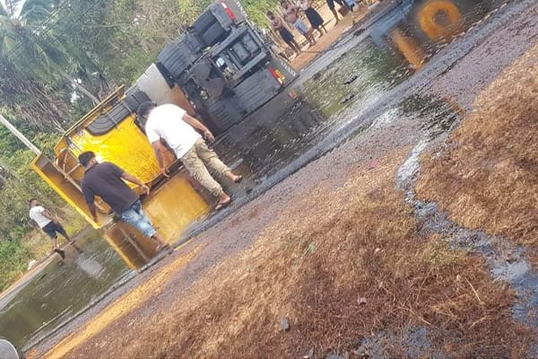 இதன்போது வீதியில் வந்த டிப்பர் வாகனம் கொட்டியிருந்த எரிபொருளில் சறுக்கி விபத்துக்குள்ளானது.