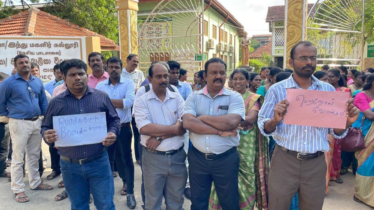 இன்று காலை யாழ்ப்பாணம் இந்து மகளிர் கல்லூரிக்கு முன்னால் ஆசிரியர்கள் போராட்டத்தில் ஈடுபட்டனர்.
