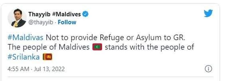 இலங்கையில் மக்கள் முன்னெடுத்துள்ள புரட்சிக்கு மாலைதீவு மக்களும் ஆதரவு தெரிவிக்கின்றனர். இந்நிலையில் கோட்டாபயவை உடனடியாக நாட்டை விட்டு வெளியேறுமாறு எச்சரிக்குமாறு தைய்யிப் கோரியுள்ளார்.
