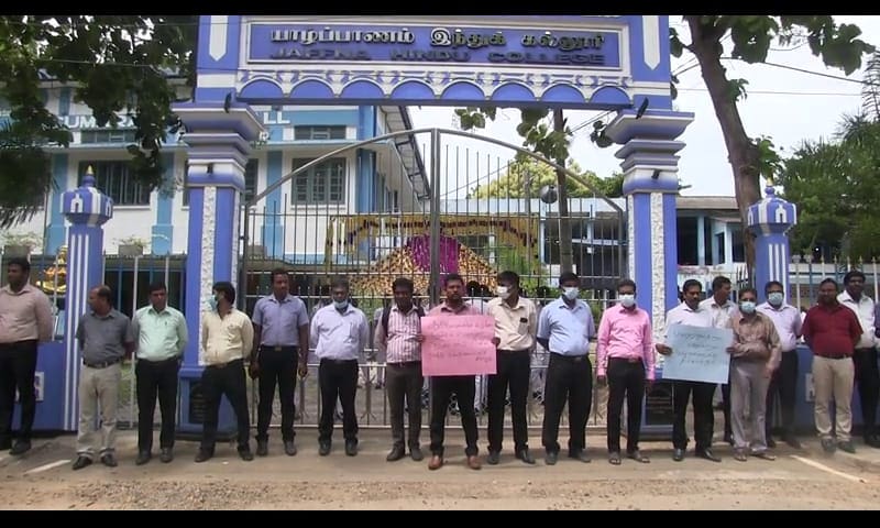யாழ்ப்பாணம் இந்துக்கல்லூரி முன்றலில் ஆசிரியர்கள் ஒன்று கூடி தமது எதிர்ப்பினை வெளியிட்டனர்.