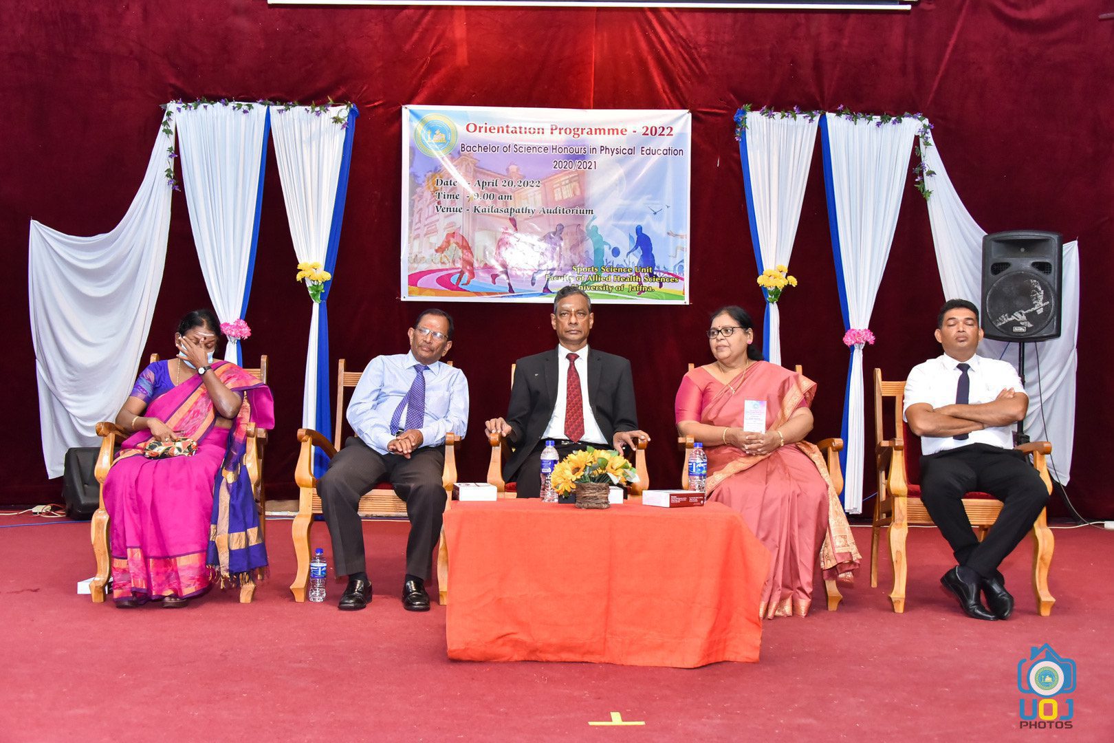 யாழ்ப்பாணப் பல்கலைக்கழகத்தில் முதன்முதலாக ஆரம்பிக்கப்படும் உடற்கல்வியியல் விஞ்ஞானமானி சிறப்பு (Bachelor of Science Honors in Physical Education) கற்கைநெறிக்கு உயர்தரப் பரீட்சை பெறுபேறுகளின் அடிப்படையிலும், விளையாட்டுத்துறை சார் திறமையின் அடிப்படையிலும் தெரிவு செய்யப்பட்ட புதுமுக மாணவர்களுக்கான திசைமுகப்படுத்தல் நிகழ்வு (Orientation Programme) இன்று (20) புதன்கிழமை இடம்பெற்றது.
