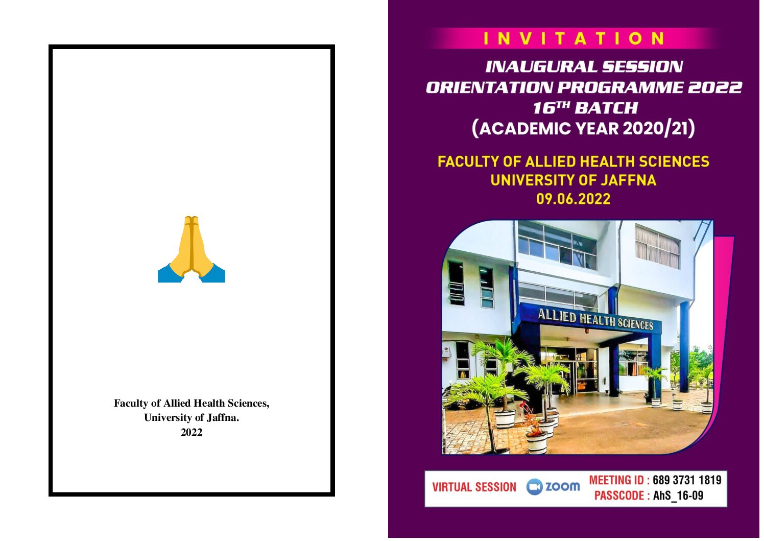 2020 / 2021 ஆம் கல்வி ஆண்டுக்குத் தெரிவு செய்யப்பட்ட மாணவர்களும், பெற்றோரும் நிகழ் நிலையூடாக இந் நிகழ்வில் கலந்து கொள்ள முடியும். நிகழ்வுக்கான இணைப்புகள் புதுமுக மாணவர்களின் பதிவு செய்யப்பட்ட மின்னஞ்சல், மற்றும் கைத் தொலைபேசிக் குறுந் தகவல்கள் வாயிலாக அறிவிக்கப்பட்டுள்ளது என்றும், இணைப்புகள் கிடைக்காதவர்கள் இணைந்த சுகாதார விஞ்ஞானங்கள் பீடாதிபதி அலுவலகத்தின் 021 320 5486 என்ற தொலைபேசி இலக்கத்துடன் தொடர்பு கொள்ளுமாறும் பீடாதிபதி திருமதி தெய்வி தபோதரன் அறிவித்துள்ளார்.