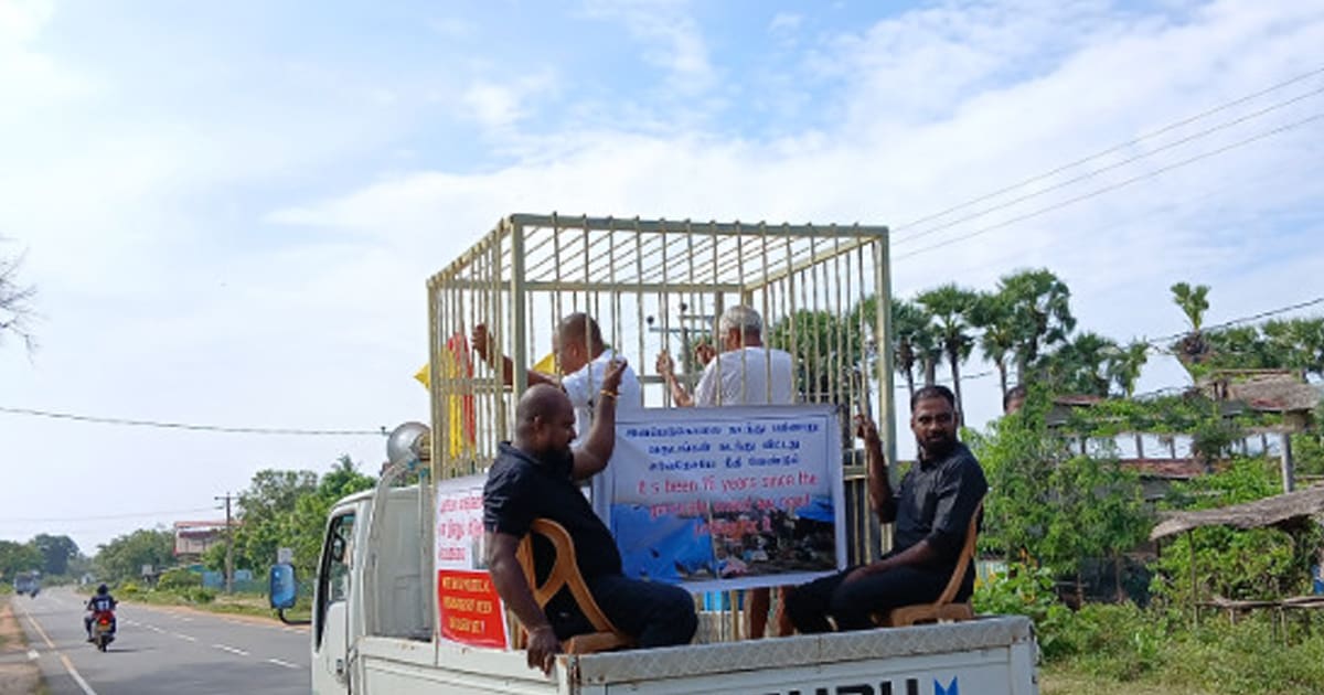 சிறைக் கூண்டொன்றுடன் பயணிக்கும் கைதிகள் போல வடிவமைக்கப்பட்ட ஊர்தியில் இந்த பவனி முன்னெடுக்கப்பட்டுள்ளது.