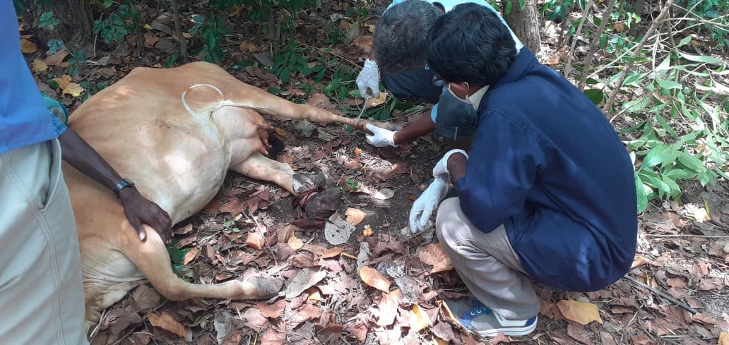 மாடுகளை அவிழ்க்க சென்ற போது பசுவின் கால் ஒன்று துண்டாடப்பட்ட நிலையில் மற்றுமொரு காலில் காயம் ஏற்படும் வகையில் தாக்குதல் மேற்கொள்ளப்பட்ட நிலையில் இரத்த வெள்ளத்தில் மாடு கிடந்துள்ளது.