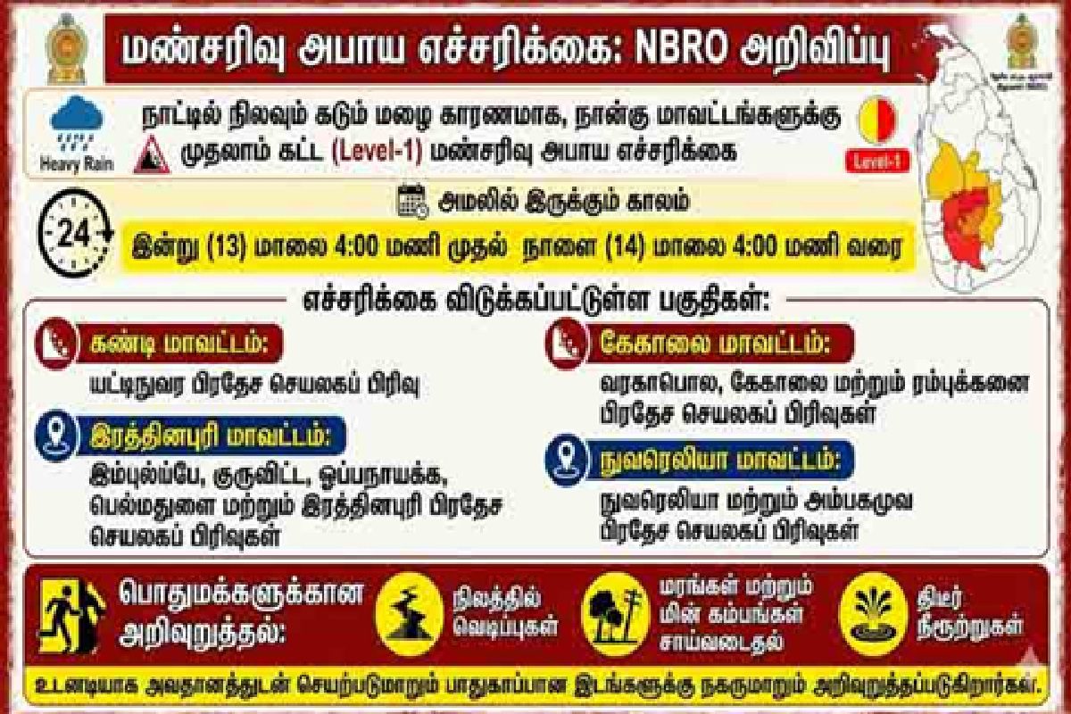 நாட்டில் நிலவும் கடும் மழைப்பொழிவு காரணமாக, நான்கு மாவட்டங்களுக்கு முதலாம் கட்ட (Level-1) மண்சரிவு அபாய எச்சரிக்கையை தேசிய கட்டிட ஆராய்ச்சி நிறுவனம் (NBRO) விடுத்துள்ளது. இந்த எச்சரிக்கை நாளை (ஏப்ரல் 14, 2026) மாலை 4:00 மணி வரை அமலில் இருக்கும் என அறிவிக்கப்பட்டுள்ளது.
