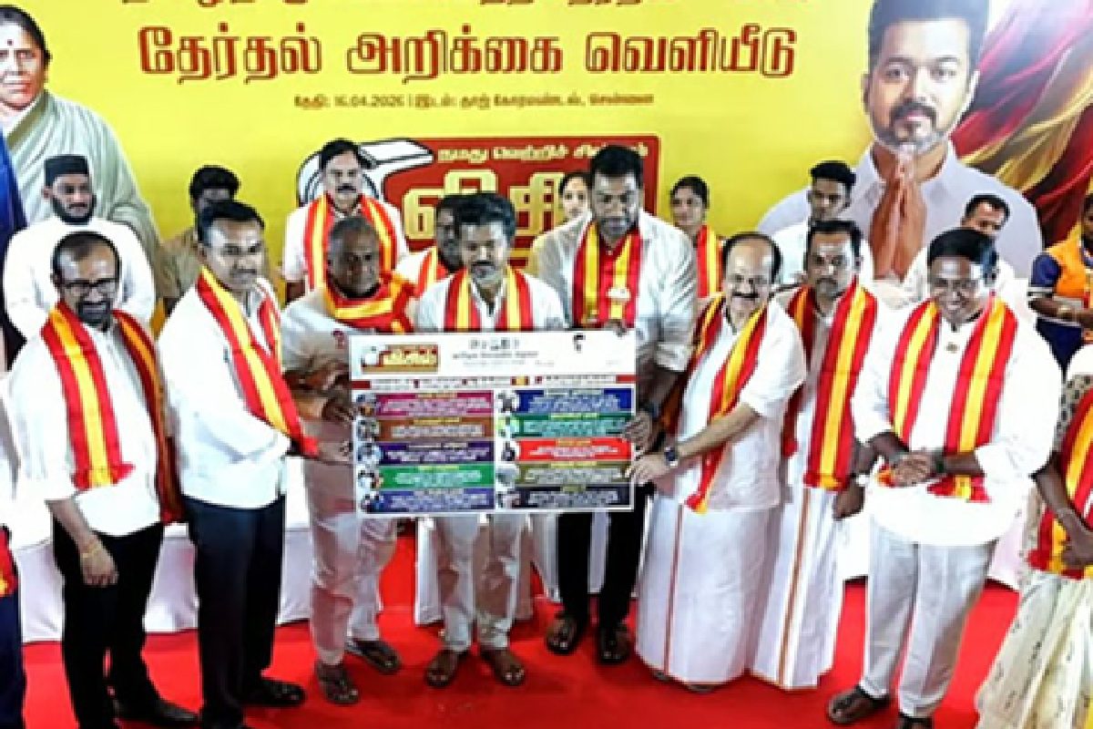 தமிழக வெற்றிக் கழகத்தின் (த.வெ.க.) தலைவர் விஜய், 2026-ஆம் ஆண்டு நடைபெறவுள்ள தமிழக சட்டப்பேரவைத் தேர்தலுக்கான தனது கட்சியின் முதல் தேர்தல் அறிக்கையை நேற்று (ஏப்ரல் 16) சென்னையில் வெளியிட்டார். நுங்கம்பாக்கத்தில் உள்ள தனியார் விடுதியில் நடைபெற்ற இந்த நிகழ்வில், விவசாயி நாராயணன் என்பவரிடம் முதல் பிரதியை வழங்கிய விஜய், “மக்களால் செய்ய முடிந்தவற்றை மட்டுமே நாங்கள் வாக்குறுதிகளாக அளித்துள்ளோம்” என்று கூறி, திராவிடக் கட்சிகளின் தேர்தல் அறிக்கைகள் மக்களை ஏமாற்றுவதாகக் குற்றம் சாட்டினார்.