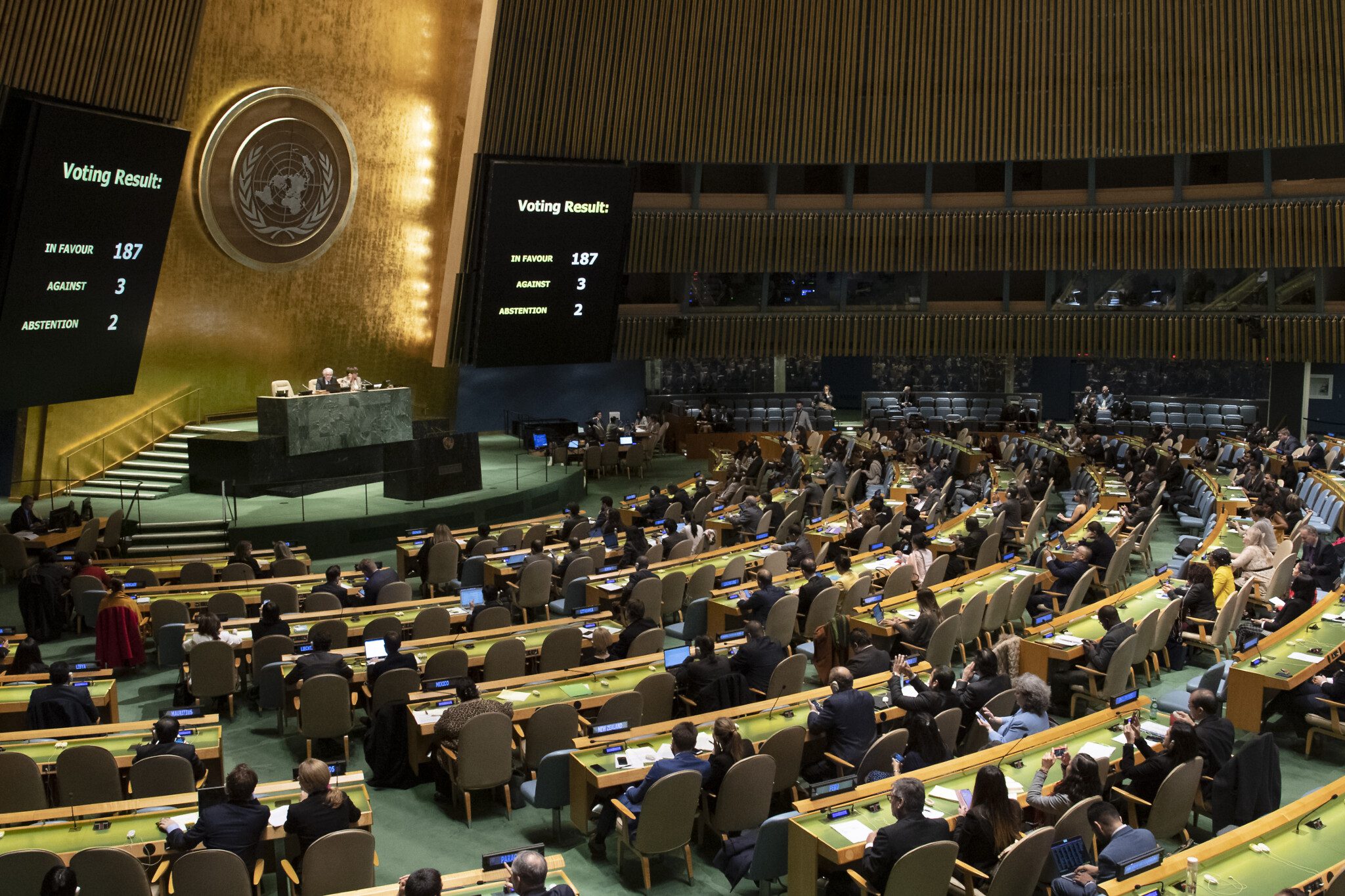 ரஷ்யா, பெலா ரஸ், வட கொரியா, சிரியா, எரித்திரியா ஆகியன மேற்படி பிரேரணைக்கு எதிராக வாக்களித்தன. 141 நாடுகள் ஆதரித்து வாக்களித்தன.