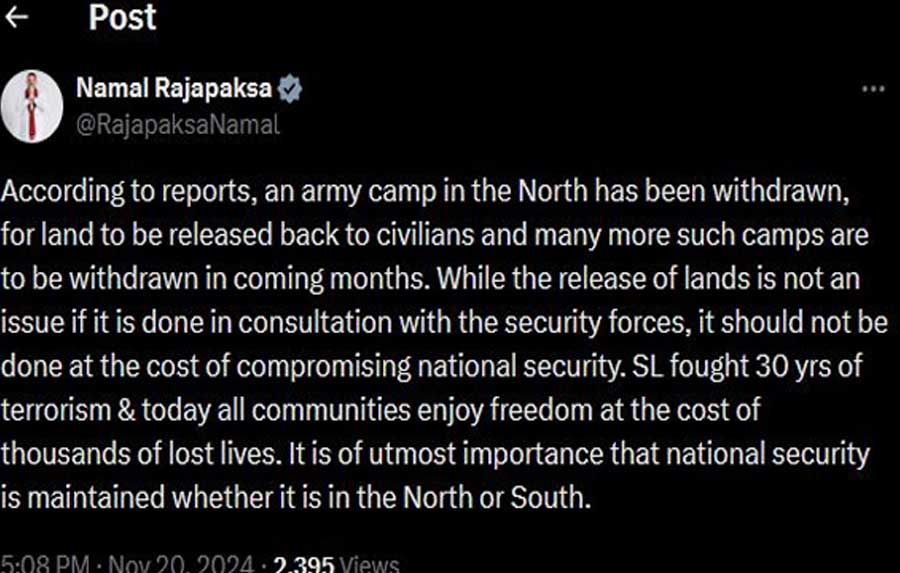 வடக்கில் இராணுவ முகாமொன்று விடுவிக்கப்பட்டமை குறித்து இன்று (20) தனது எக்ஸ்(X) பக்கத்தில் இட்ட பதிவொன்றிலேயே அவர் இதனைத் தெரிவித்துள்ளார்.